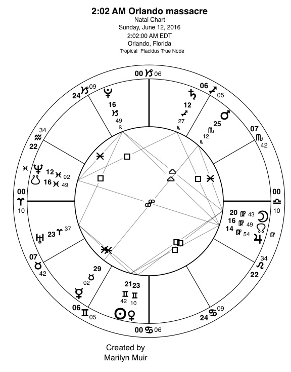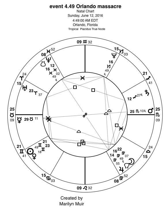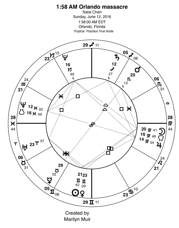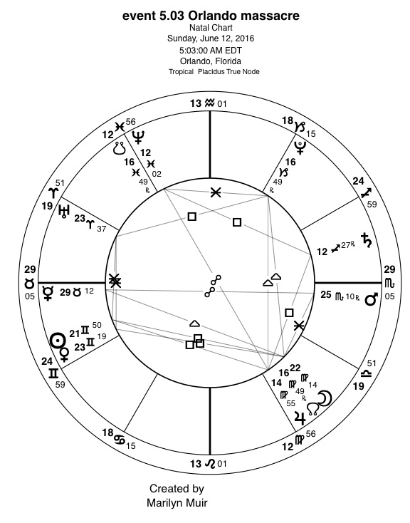 This was my experience as the news broke of the massacre at the Pulse nightclub in Orlando, FL on June 12, 2016. This is only an hour away from my home in the Disney-like celebration atmosphere of the City of Orlando. We have lived the horror one day at a time, hour by hour, as authorities attempted to uncover what happened and why. Our TV channels have been full of the heartbreak and the grief, and finally the celebrations of the lives that were lost. Timelines kept changing. It is difficult to research when you can’t pin down the times. Even now there is a four-minute discrepancy, but I can work with that. Yesterday the birth time of the shooter came into my hands. Time to go to work!