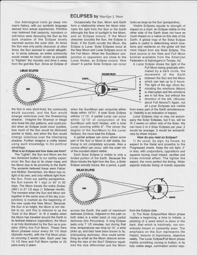 Pre-Natal Eclipses:                 While I have not done much work with the concept at this point, there is a wonderful book by Karen McCoy and Jan Spiller, Spiritual Astrology, Your Personal Path to Self-Fulfillment. I had the great good fortune to proof-read it before it was published. It is full of good information and a thorough expose of the concept of Pre-Natal Eclipses.If you are interested, this is the place to start. Karen is a very good astrologer from the Fort Lauderdale area (2000) where I practiced as well. If interested in pursuing this concept, start with her book.