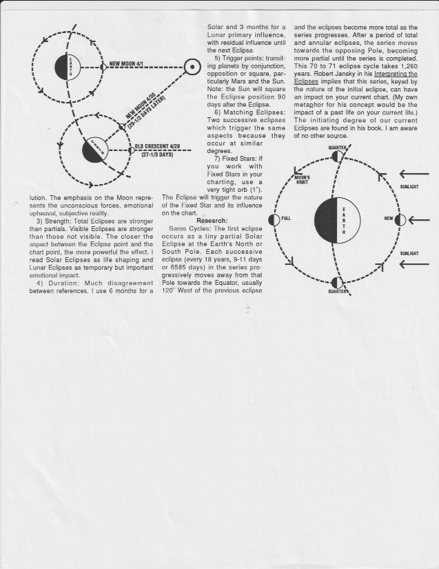 Saros Cycles:               The first Eclipse occurs at the Earth’s North or South Pole. Each successive Eclipse (every 18 years, 9-11 days, or 6585 days) in the series progressively moves away from that Pole towards the Equator, usually 120˚ west of the previous Eclipse. The eclipses become more total as the series progresses. The series moves towards the opposing Pole, becoming more partial until the series is complete. This 70 to 71 Eclipse cycle takes 1,280 years to complete. Robert Jansky in his Interpreting the Eclipses implies that this series, keyed by the nature of the initial Eclipse, can have an impact on your current chart. (My own metaphor for his concept would be the impact of a past life on your current life.) The initiating degree of our current (2000) Eclipses are found in his book.