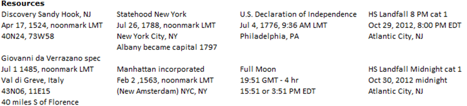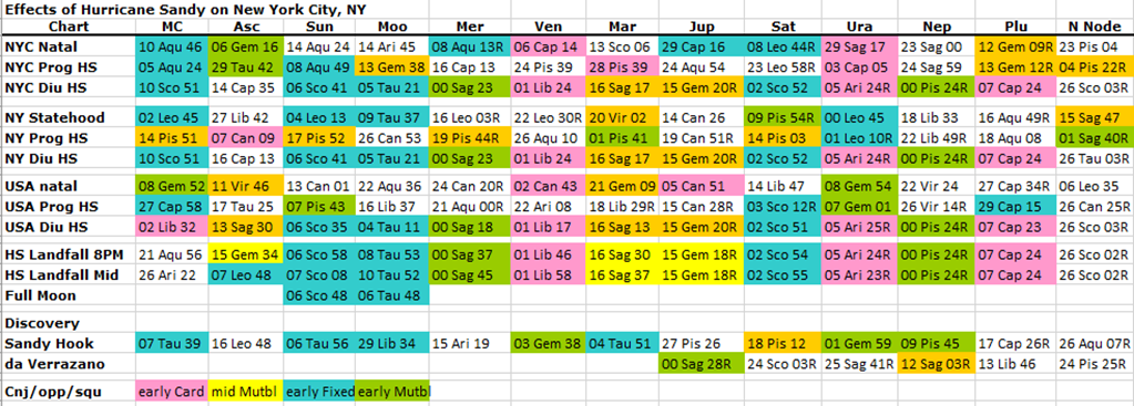 The same connections will show in progressed to progressed and progressed to natal between the various legal entities. See the chapter 5 spreadsheet which follows. For the balance of this chapter, I will focus on the founding of Manhattan comparing its natal, Sandy progressed and Sandy diurnal.
