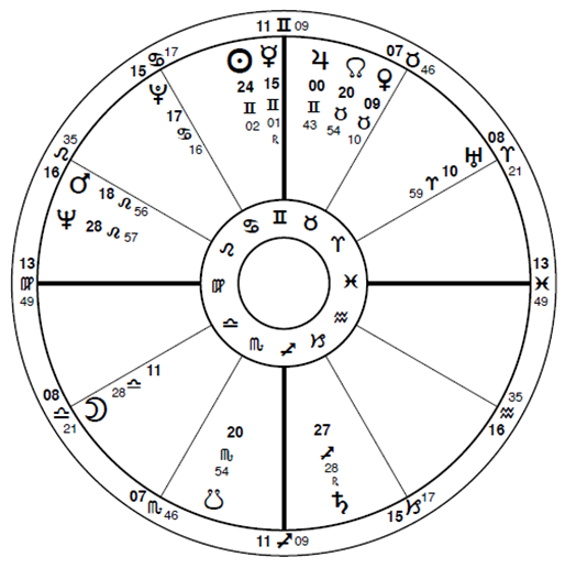 - GHC diurnal Mars 16 Sagittarius 15 and Jupiter 15 Gemini 20R, T-square natal Mercury (chart ruler) 15 Gemini 01R, progressed Sun 13 Virgo 55, Jupiter 15 Gemini 06, mid-mutable.