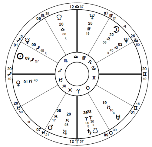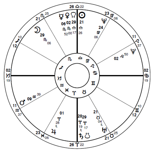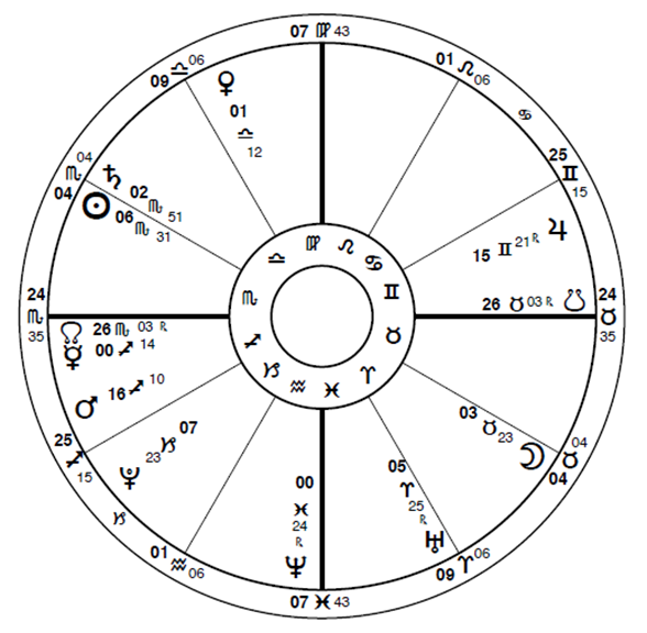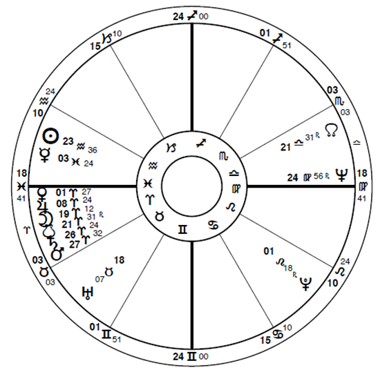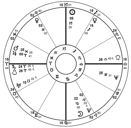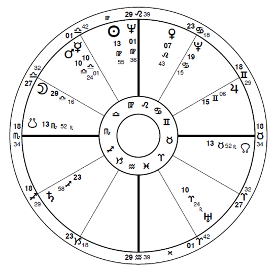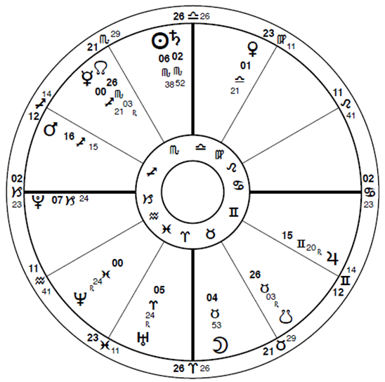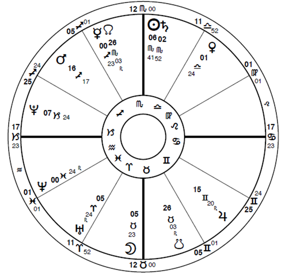 - LGA diurnal Sun 6 Scorpio 31, Saturn 2 Scorpio 51, Moon 3 Taurus 23, square natal Pluto 2 Leo 45R, progressed Pluto 1 Leo 18R, early fixed.