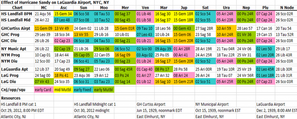 On October 29, 2012, mega storm Hurricane Sandy slammed into the northeast seaboard inflicting billions of dollars of destruction, loss of power, service, access and lives, devastating an entire area hosting millions of people, families and lives. This was my fifth astrological research project on the effects of the storm while we were still reeling from the impact. Aside from the generalities and effects on our nation, our states and municipalities, major transportation working features of the New Jersey / New York area were swamped. A vast area of New Jersey was inaccessible to emergency vehicles, buses, and automobiles. The New York City subway and New York City’s LaGuardia Airport were both flooded and completely shut down for days. I completed the subway topic earlier, and now I will tackle the airport issues. This is a more involved subject and will take a moment to explain, but it is necessary for the astrological workup.