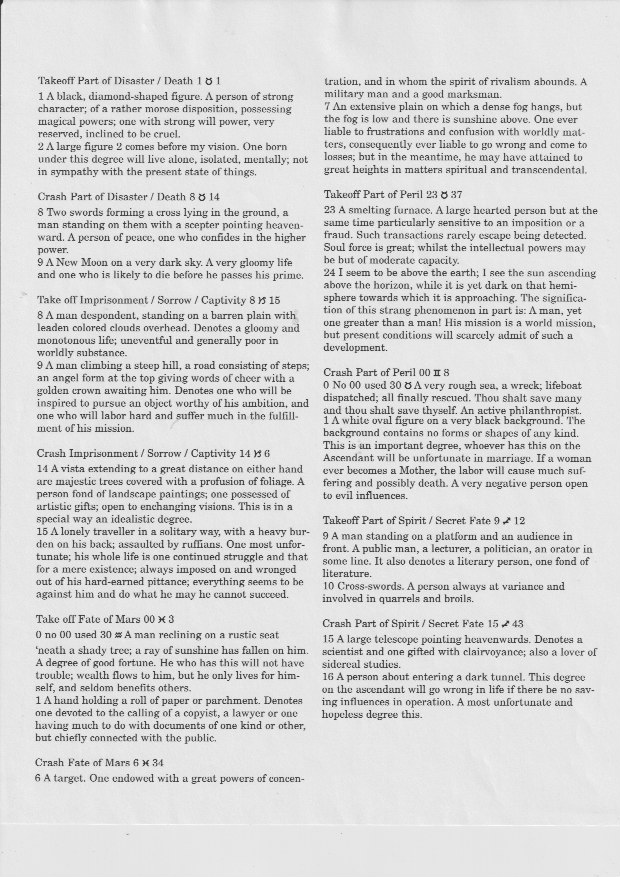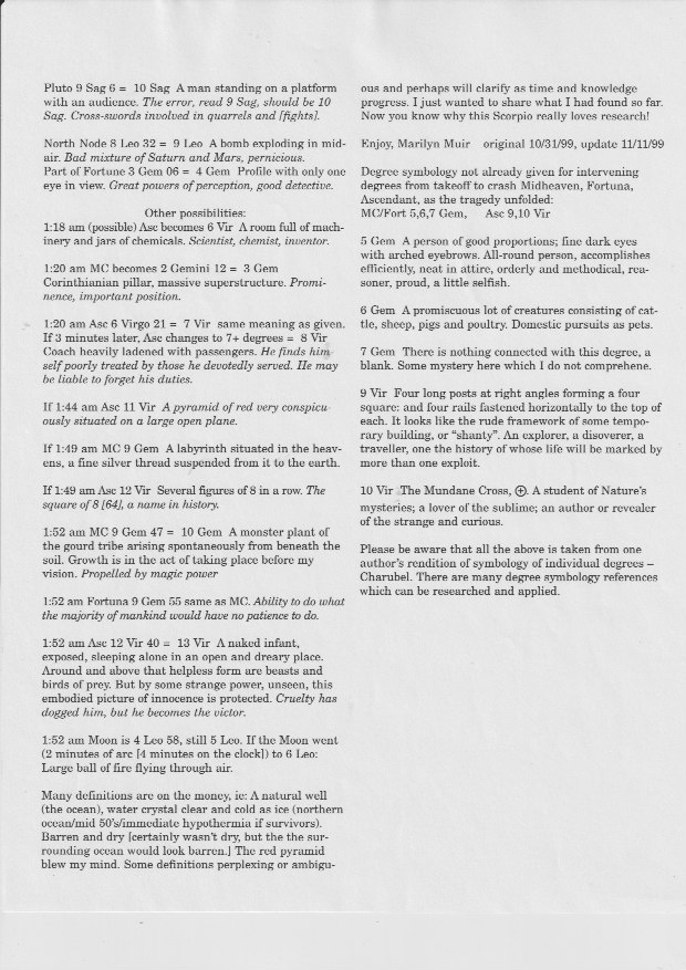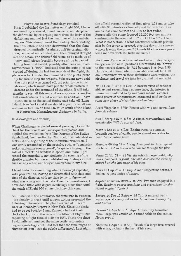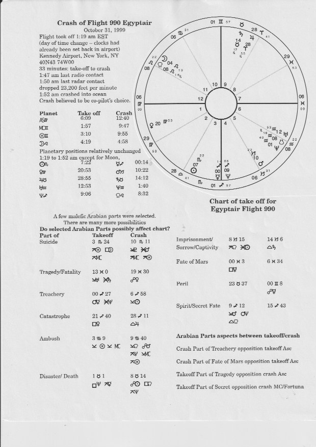 Page 9 Crash of Flight 900 Egyptair example. Note there is one natal wheel for two events, takeoff and final crash into the ocean, which were only 33 minutes apart. I did not think two charts were necessary for that short interval. The narrative illustrates the fateful activations for the tragedy. The breakdown at the bottom of the page shows definitive activation of very specific APs. Note the four final sentences on that page. Amazing!