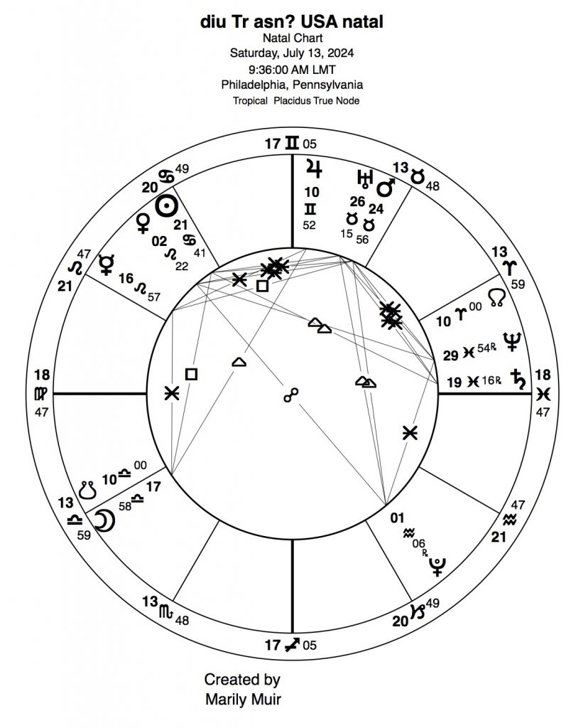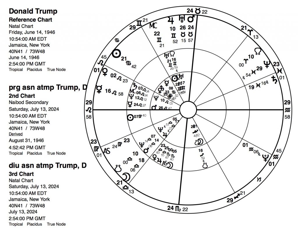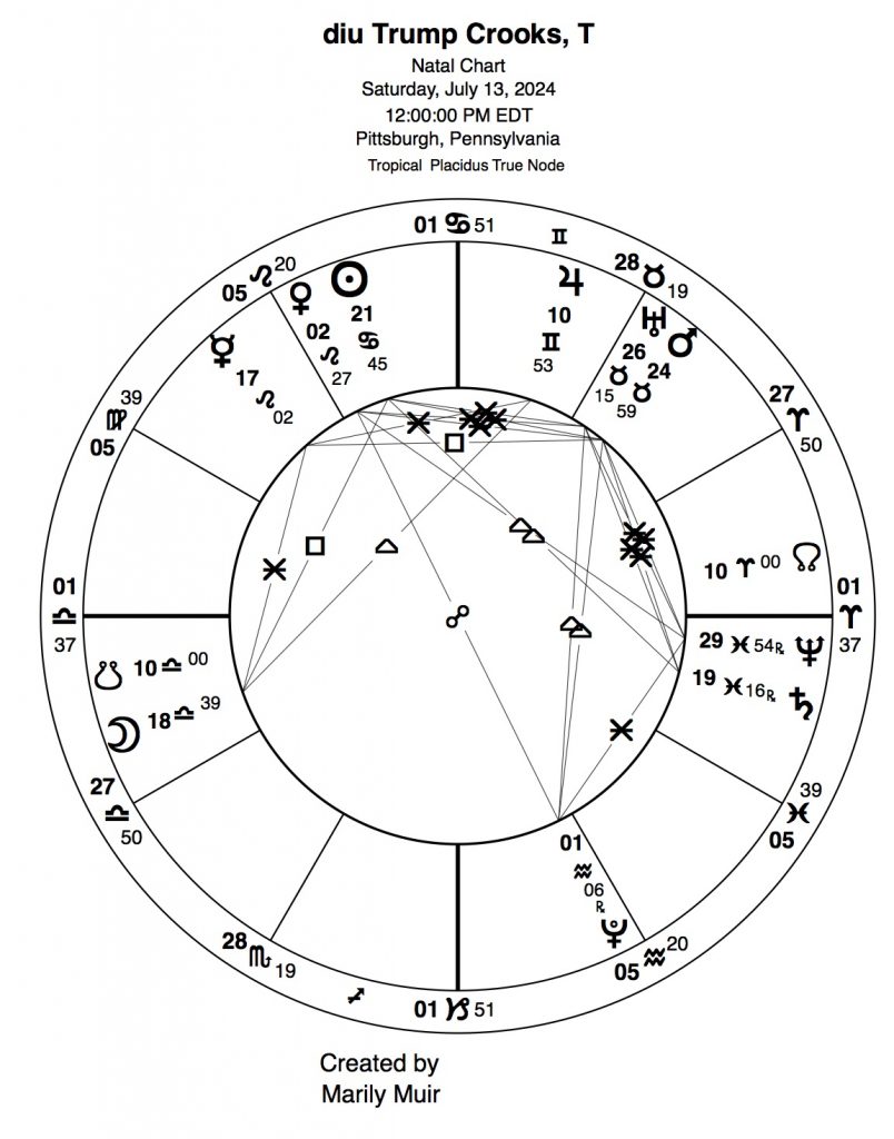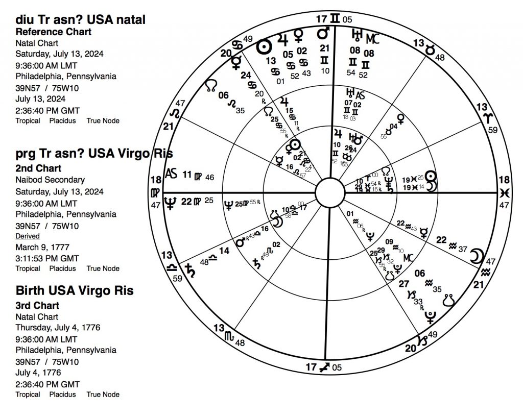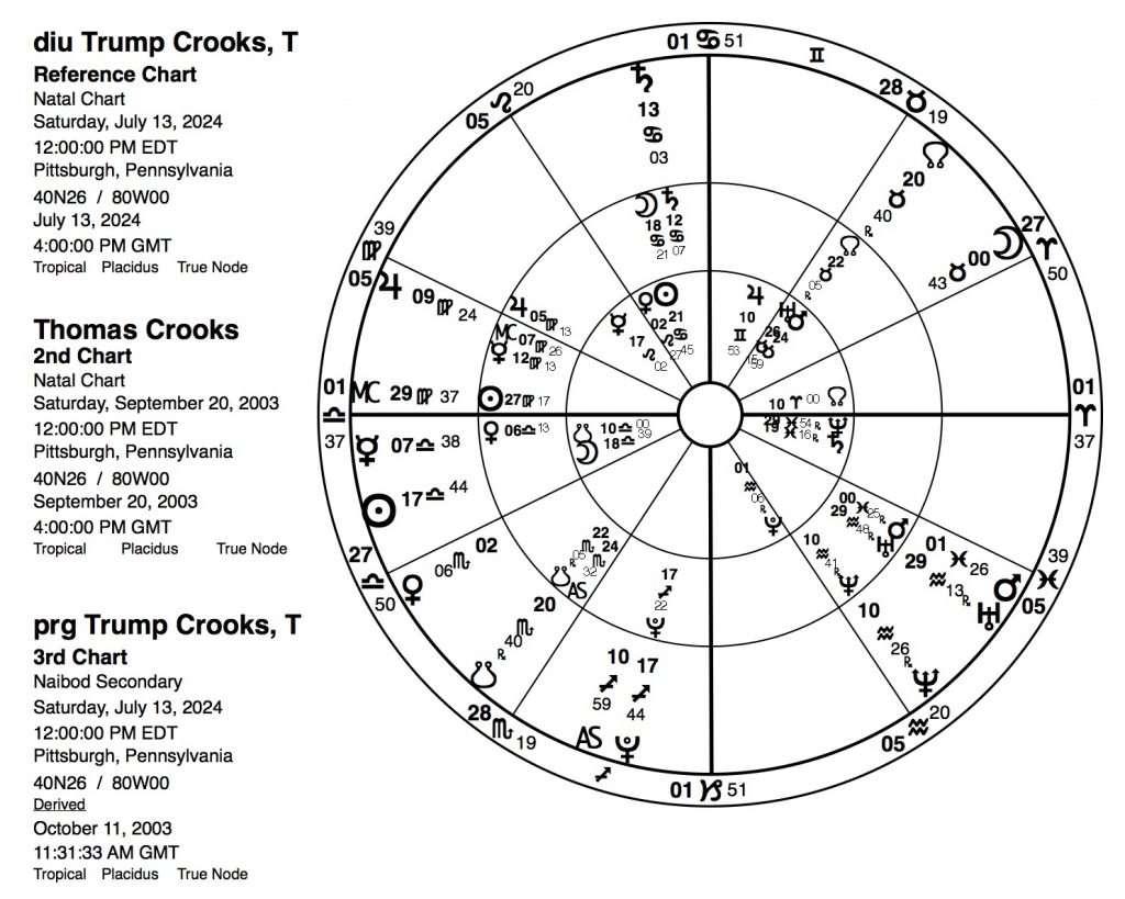 Because the article was so long and I have more charts to cover, it seemed advisable to make this a two-part article.  Part I covered the noonmark natal for the shooter, Thomas Crooks, the natal for the intended victim, ex-President Donald Trump, the natal for the US Declaration of Independence Virgo rising chart, and the event chart (shooting itself), plus the progressions for Crooks, Trump and the D of I charts. Now I need to complete the picture for each – the transits for that day as they affected their personal natals. Note that the referenced natals and progressions were given in part I and will not be reprinted in part II because we have six more charts to examine.