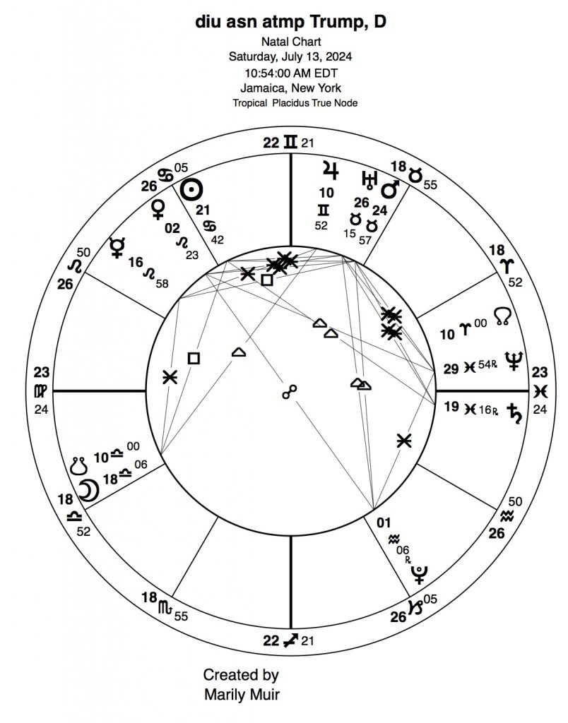 Anything else? Because we have covered some of this in part 1, I will only point out the malefic Mars / Uranus conjunction at the base of this attempt that sits on Trump’s natal Midheaven (worldly achievement and position), squaring his natal Ascendant / Mars conjunction (physical body / aggressive presentation).