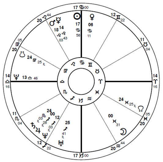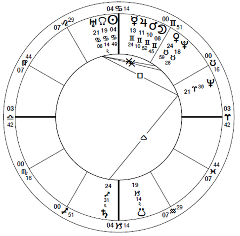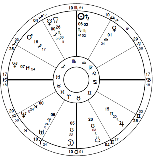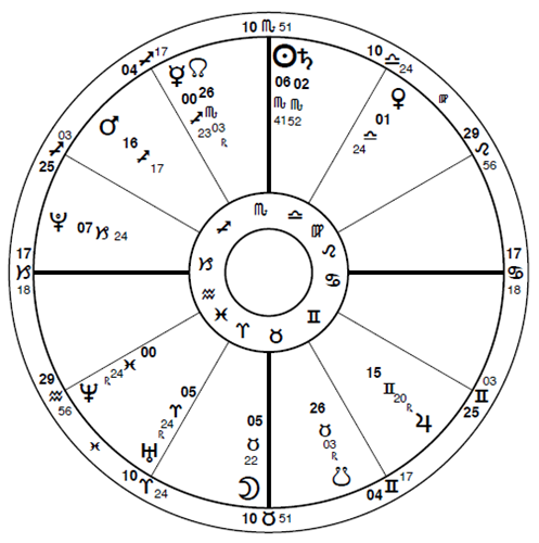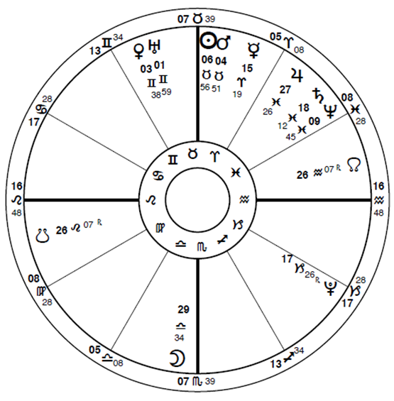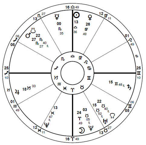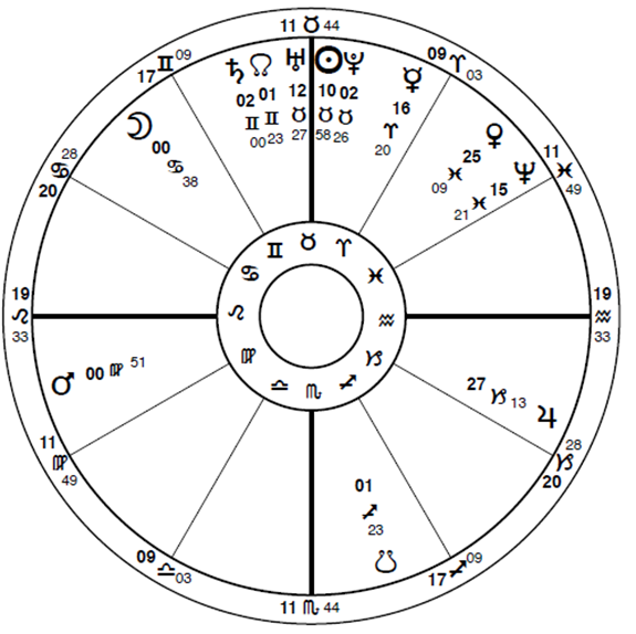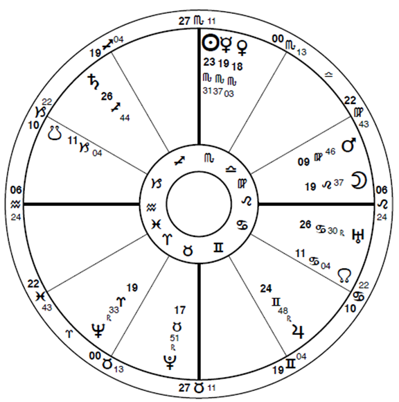 • The noonmark Ascendant is 19 Leo 33 and the chart ruler is that elevated Sun, with the verve, drama and stage presence of Leo along with Mars in the 1st in practical Virgo – lots of assertion, aggression, and dynamic activity.