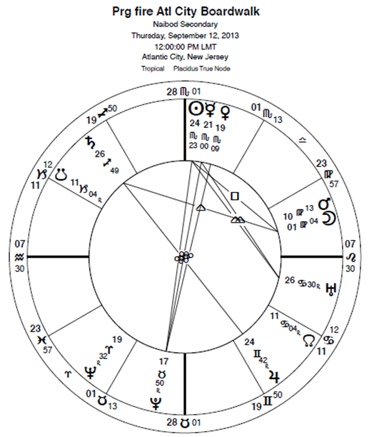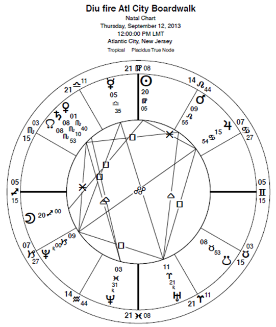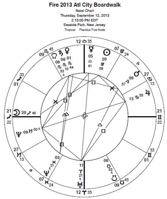 As a result, I learned far more about the Boardwalk than previously, and it has had an eventful history as far as fire and other damage occurrences. Of course, I set the charts for the fire…  September 12, 2013, at 2:15 PM EDT, Seaside Park, NJ, same coordinates as Atlantic City (listed on the spreadsheet).