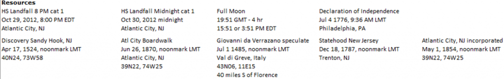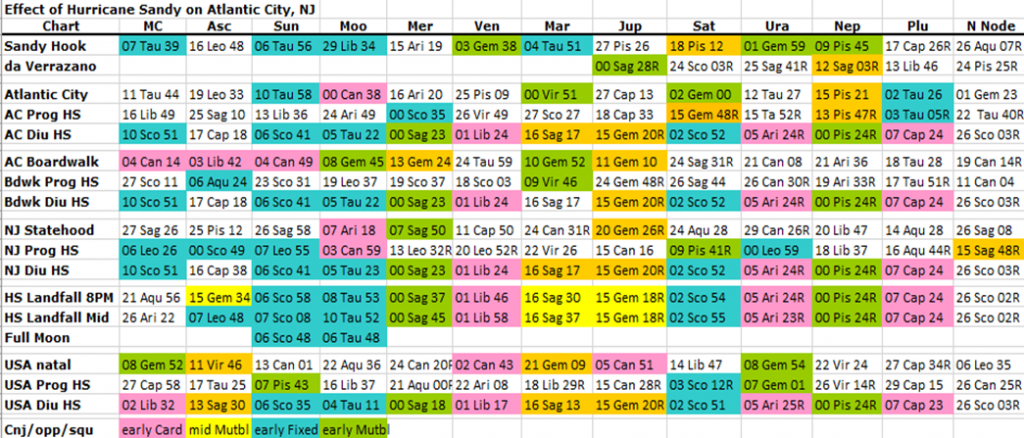 I am not yet even looking at the city of Atlantic City noonmark natal, progressed, Sandy landfall diurnal, the state of New Jersey natal, progressed, diurnal, or the USA natal, progressed, diurnal, but it is not difficult to deduce that  they will show connections as well.  For example, because I have done so much work with the timed U.S. chart, I know that natal Saturn is located at 14 Libra 47. Sandy Hook’s Pluto is 13 Libra 46, only1˚ orb. The listed nodes are 2˚ from the U.S. natal Neptune at 22 Virgo 24. I am definitely in a reasonable ballpark.